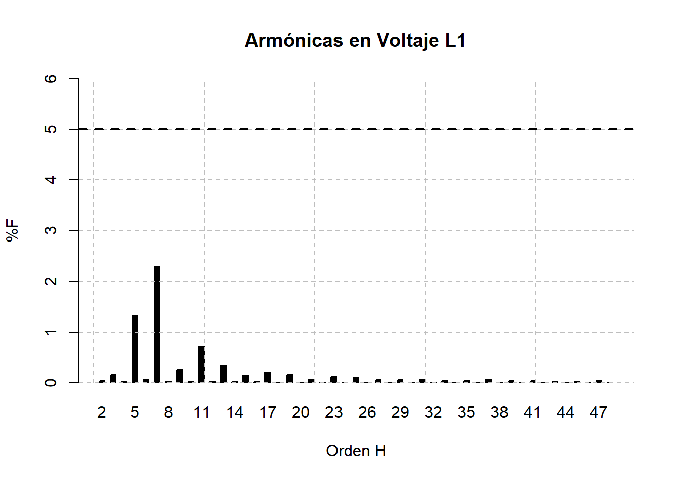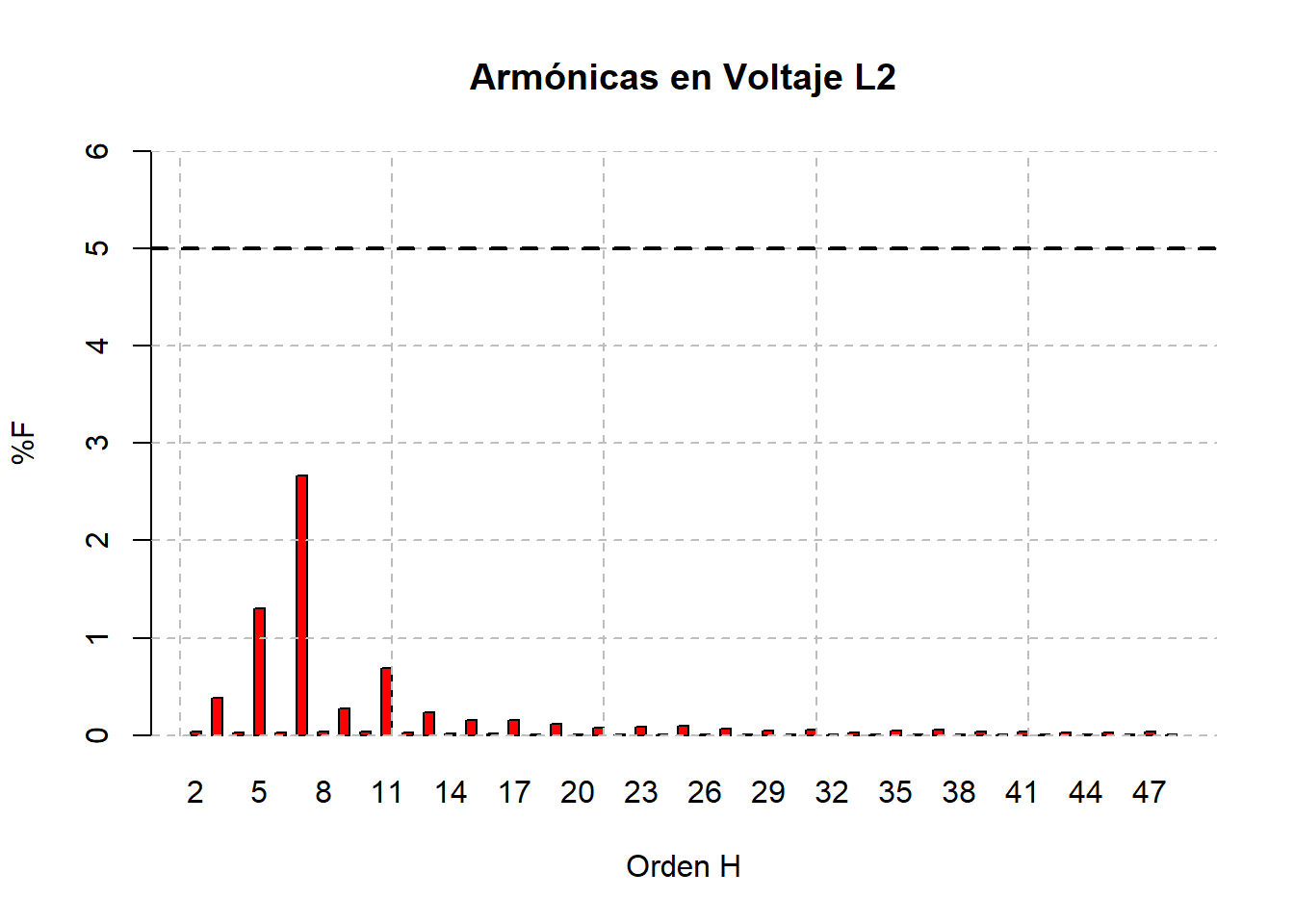 La DATD medida fue de 8.56% siendo el límite de 8%. Y la armónica 5ª tiene un valor de 7.39% siendo el límite de 7%. Reduciendo la 5ª armónica se puede cumplir con ambos índices, se recomienda revisar en los transformadores en cual de ellos se tiene la mayor aportación de la 5ª armónica y tratar de eliminarla o reducirla.