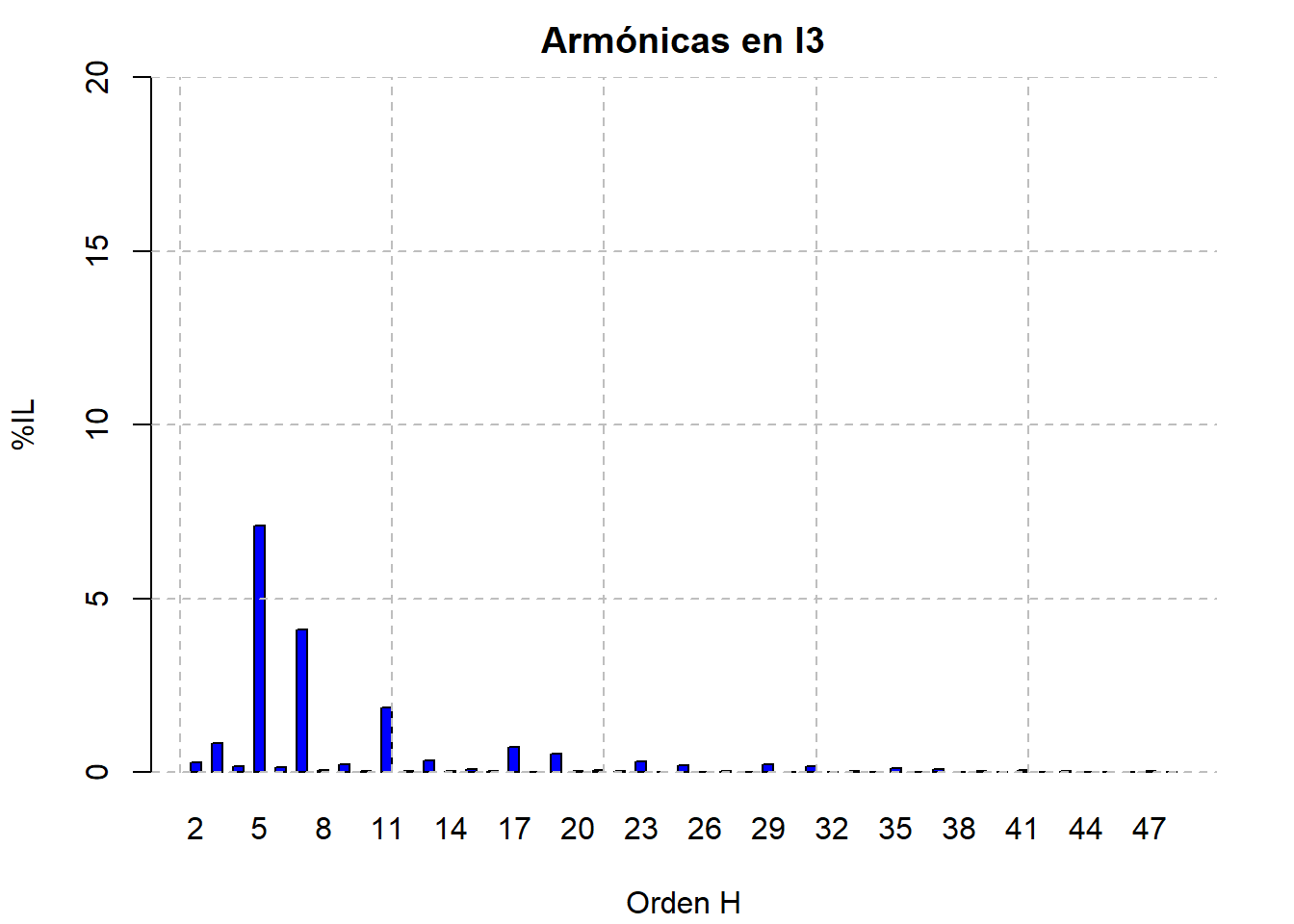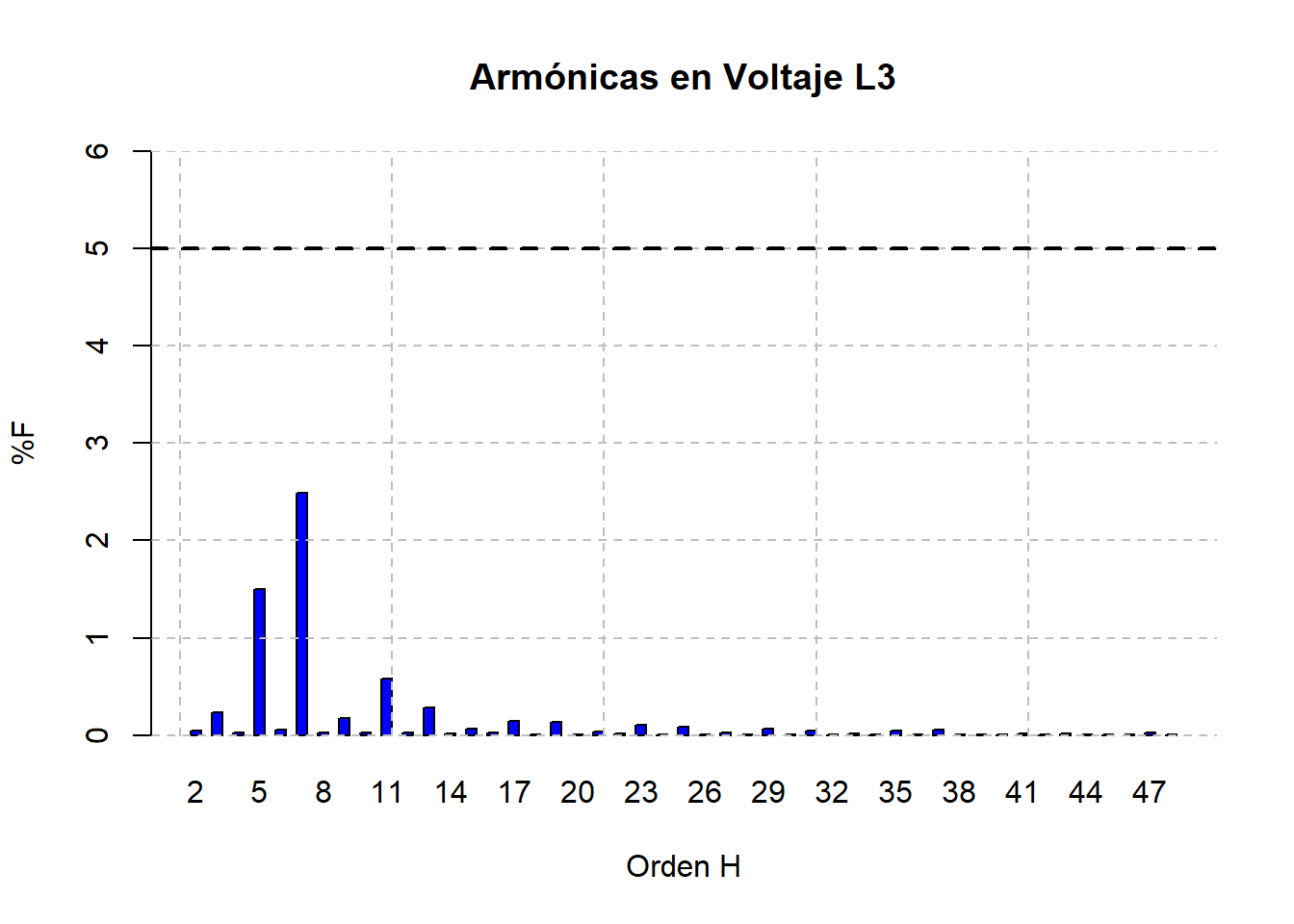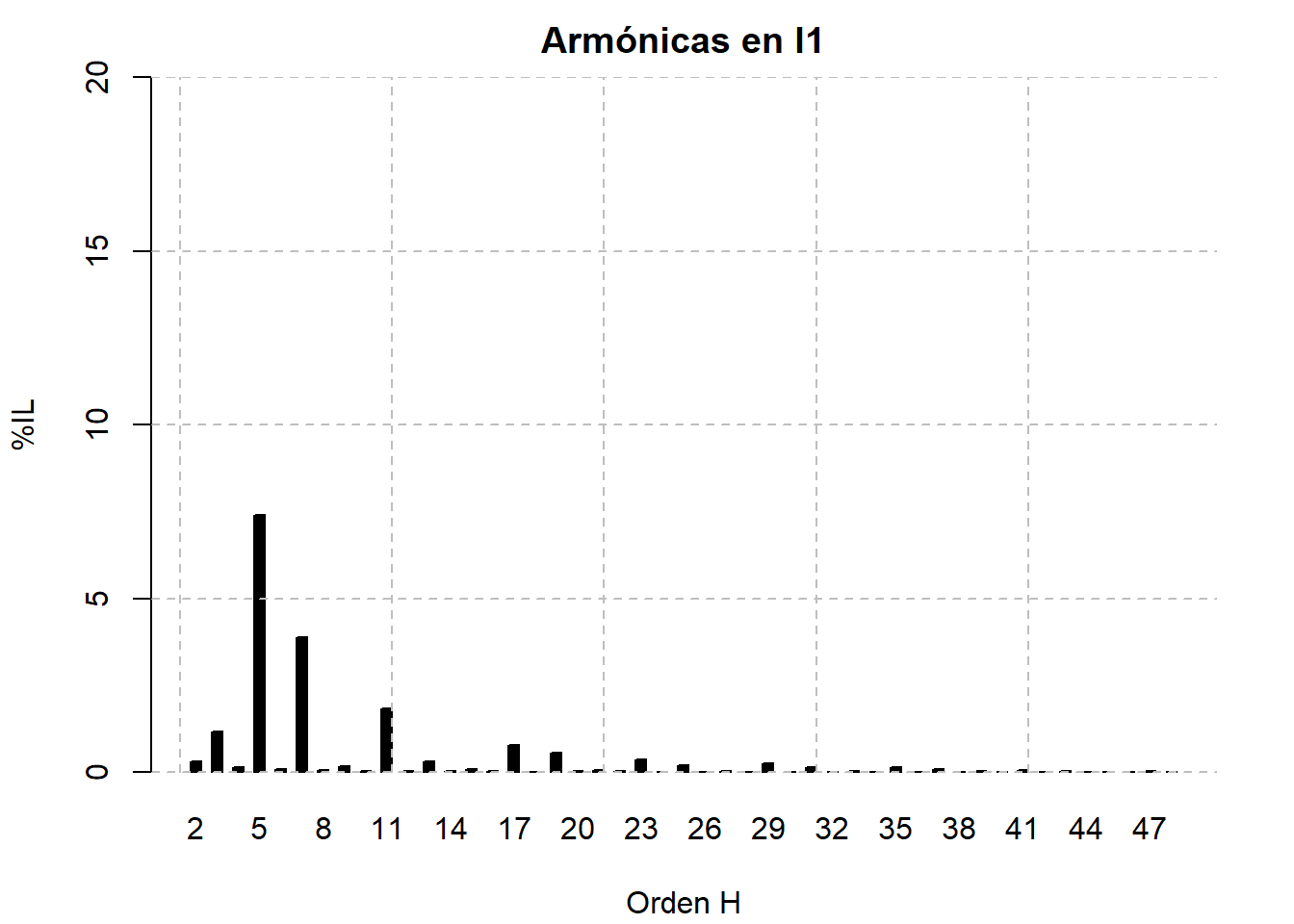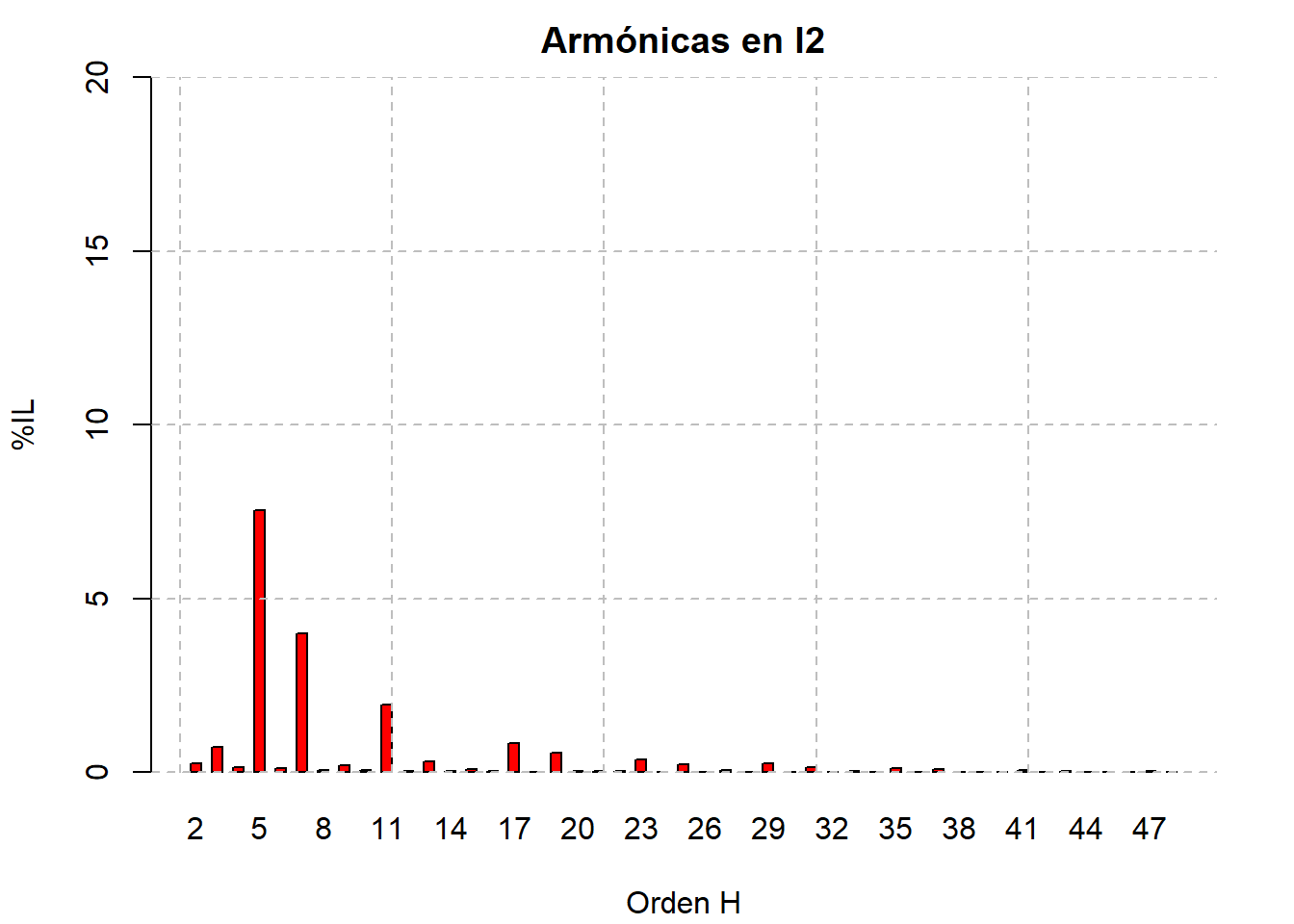 - El comportamiento de las armónicas de la corriente siguen un comportamiento normal, donde la armónica 5ª es la de mayor magnitud, seguida de la 7ª y 11ª. Por otro lado, las armónicas de la tensión siguen un comportamiento diferente, donde la armónica 7ª es la de mayor valor, seguido de la 5ª y 11ª, esto puede indicar una posible resonancia en la armónica 7ª. Es importante verificar esta frecuencia de resonancia entre el transformador y los elementos capacitivos conectados en su secundario.
